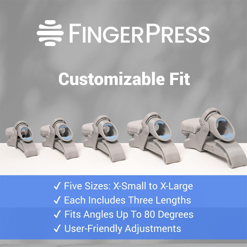 - Customizable Fit for Any Finger: With five different sizes designed to fit most hands, the FingerPress can be worn on your index, middle, ring, or pinky finger. The innovative four-point balance system evenly distributes pressure, keeping the device securely in place without rotating or sliding. Simply measure your finger width using our easy sizing guide, then adjust the ratcheting angle for a personalized level of stretch.