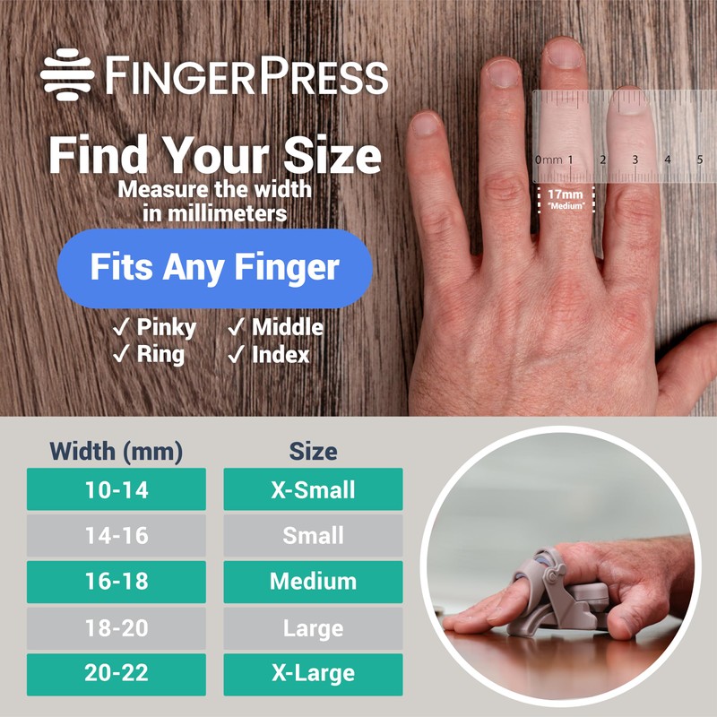 - Customizable Fit for Any Finger: With five different sizes designed to fit most hands, the FingerPress can be worn on your index, middle, ring, or pinky finger. The innovative four-point balance system evenly distributes pressure, keeping the device securely in place without rotating or sliding. Simply measure your finger width using our easy sizing guide, then adjust the ratcheting angle for a personalized level of stretch.
