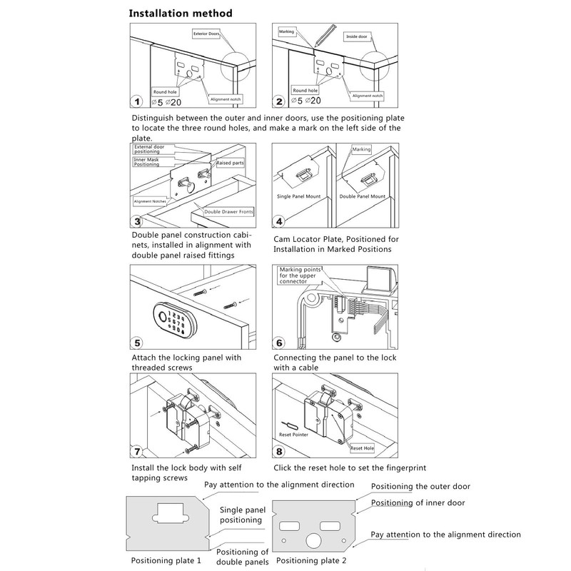 1、Three Way to Unlock: This smart cabinet lock can be unlock by fingerprint or password or card key, which provides you various ways to access the lock. There is also an additional USB key for the metal one as a backup plan just in case the lock does not function properly. Fingerprint and password setup is easy, phone and APP are not needed. 2、Support 100 Fingerprints and 1 Password and 1 Card Key: The database can save up to 100 fingerprints. Only one set of numeric passwords can be set, More security, more attention to your privacy. And with a card key to unlock. There is also only one USB key, in case neither of the three methods above can be unlocked in the event of a power failure. 3、Power Efficient and Emergency Backup Power: This biometric cabinet lock use 4 AAA batteries (batteries not included) as the only power supply, and battery can be used up to 1 year normally before replacement. There is an USB port on the side of the keypad as an emergency power supply just in case that it runs out of battery suddenly. 4、Easy Installation: Our fingerprint cabinet lock is suitable for single door wooden cabinets with a thickness of 0.47 inches to 0.62 inches. If the thickness is smaller than this size, just install it with more thin screws. 5、Durable Construction: Made of ABS and zinc alloy for long lasting durability. Ideal for securing drawers, cabinets, and lockers. Battery powered design ensures reliable access control.