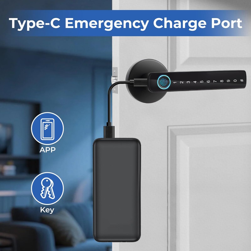 - LONG BATTERY LIFE: The Smart Door Handle is powered by 4 x AAA batteries that provide up to 20 months of use (with low battery alert) 10 times a day. It also features a Type-C emergency charging port to ensure uninterrupted access even in the event of a drained battery blackout.