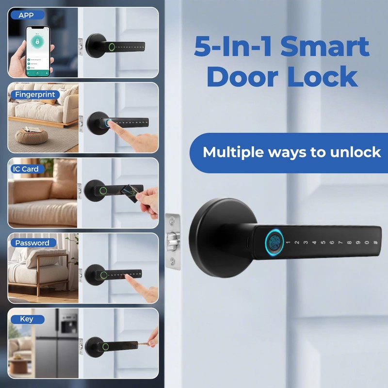 - 5-IN-1 SMART DOOR LOCK: Semiconductor fingerprint (99% accuracy, 1 second unlock) + Temporary/permanent password + Graffiti smart app control + 2 emergency keys + 2 key cards. Ideal for moments when keys are lost, phone batteries run out or hands are busy.