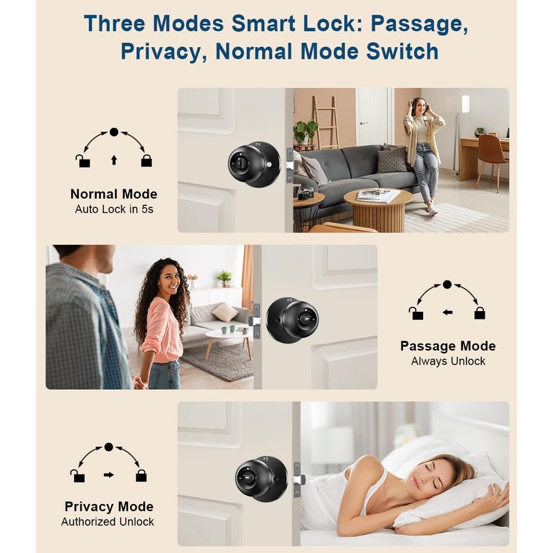 • 4-in-1 Unlocking System: Experience convenience with our smart door knob featuring four unlocking methods: fingerprint recognition (20 users), personalized passwords (20 users), app Bluetooth control (gateway required for remote access), and backup keys. Enjoy automatic locking, passage mode, private mode, and an anti-peep keypad for enhanced security.
