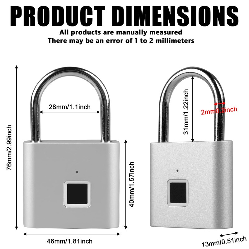 - Versatility: The fingerprint lock is compact and easy to use and carry. The powerful smart universal fingerprint lock is suitable for indoor and outdoor areas such as bags, gyms, company cabinets, suitcases, bicycles, offices, garages, warehouses, etc