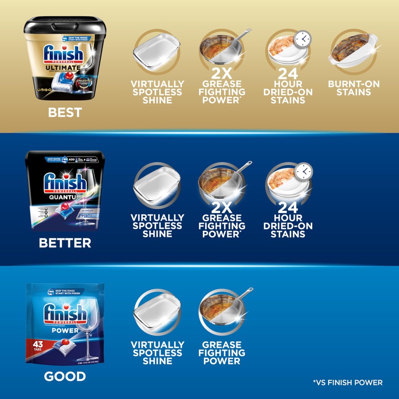 - THE CLEAN YOU CAN TRUST: Finish Power detergent tabs are formulated to deep clean, fight grease, and leave your dishes with a virtually spotless shineno pre-rinsing needed.