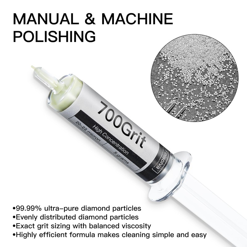 - HIGHLY EFFICIENT OIL-BASED FORMULA: 20-23 Micron (700 Grit), 5-gram premium, diamond paste syringes with a high concentration of diamond powder that are ideal for Lapping Metals. Featuring 99.99% pure diamond particles, uniform sizing, and precise grit with moderate viscosity. The diamond lapping compound paste delivers a smoother polishing experience, boosting shine and sharpening edges, and cleans up easily after use without dilution.