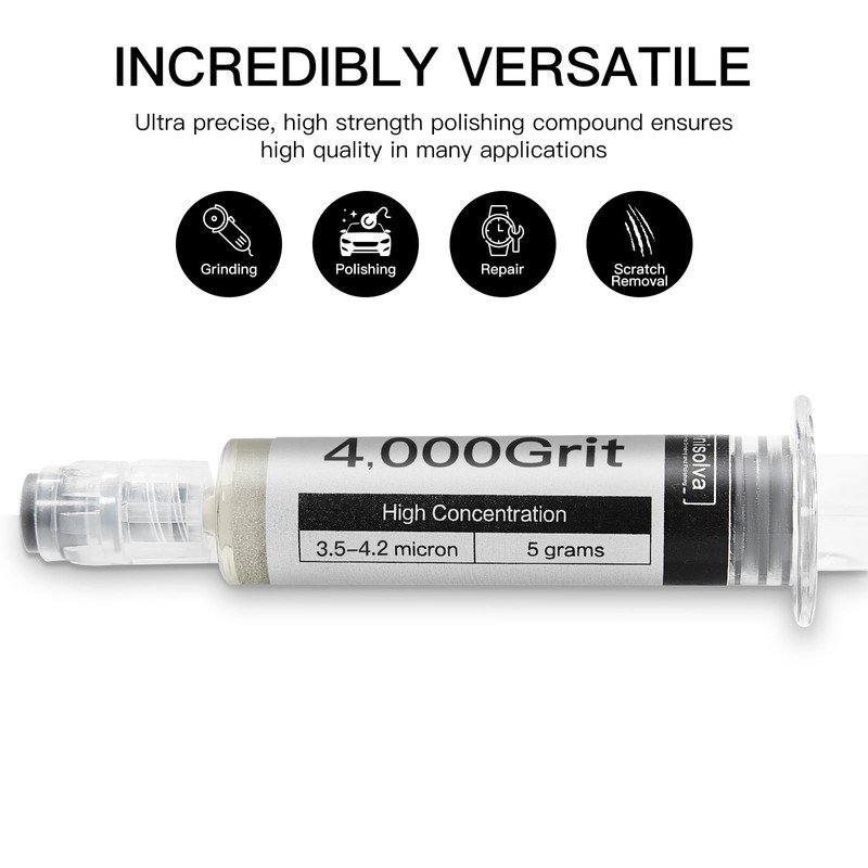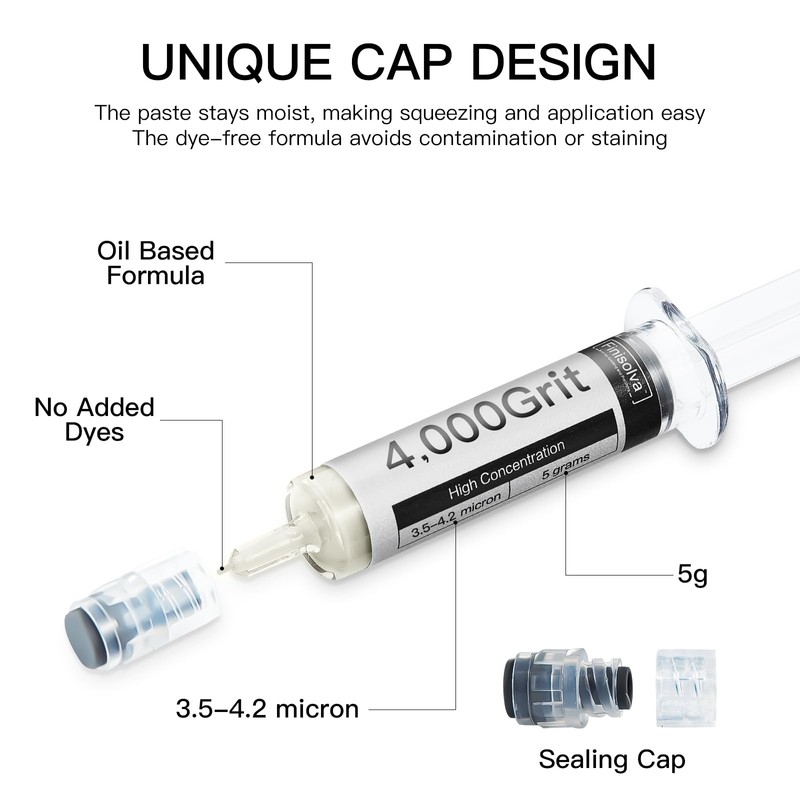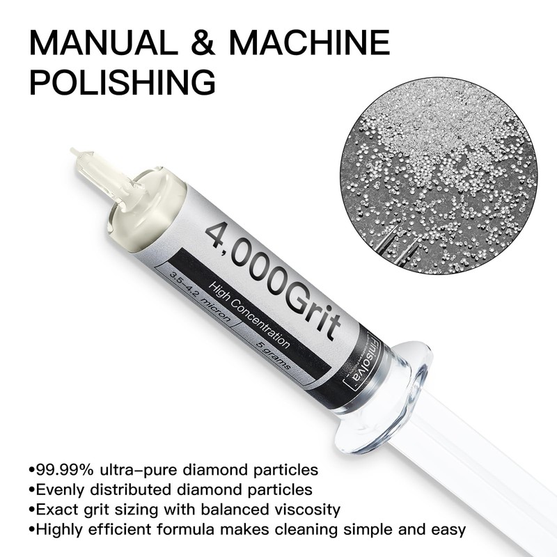 - HIGHLY EFFICIENT OIL-BASED FORMULA: 3.5-4.2 Micron (4,000 Grit), 5-gram premium, diamond paste syringes with a high concentration of diamond powder that are ideal for Fine Polish. Featuring 99.99% pure diamond particles, uniform sizing, and precise grit with moderate viscosity. The diamond lapping compound paste delivers a smoother polishing experience, boosting shine and sharpening edges, and cleans up easily after use without dilution.
