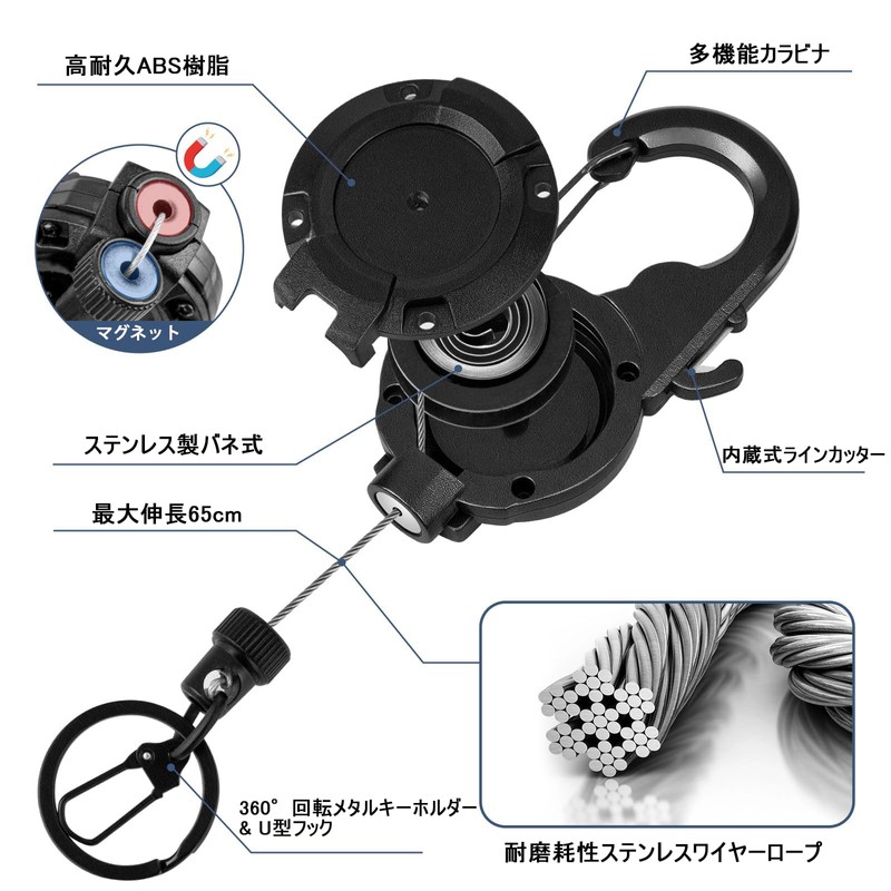 - Multi-functional design and easy to use: 1. Built-in cutter: Easily cuts fishing line and cable ties, 2. U-shaped hook: Easily store small items that are difficult to fix with regular carabiners. 3. Elastic cord (up to 25.6 inches (65 cm)): Stretches smoothly when you need it, and stores compactly when not in use