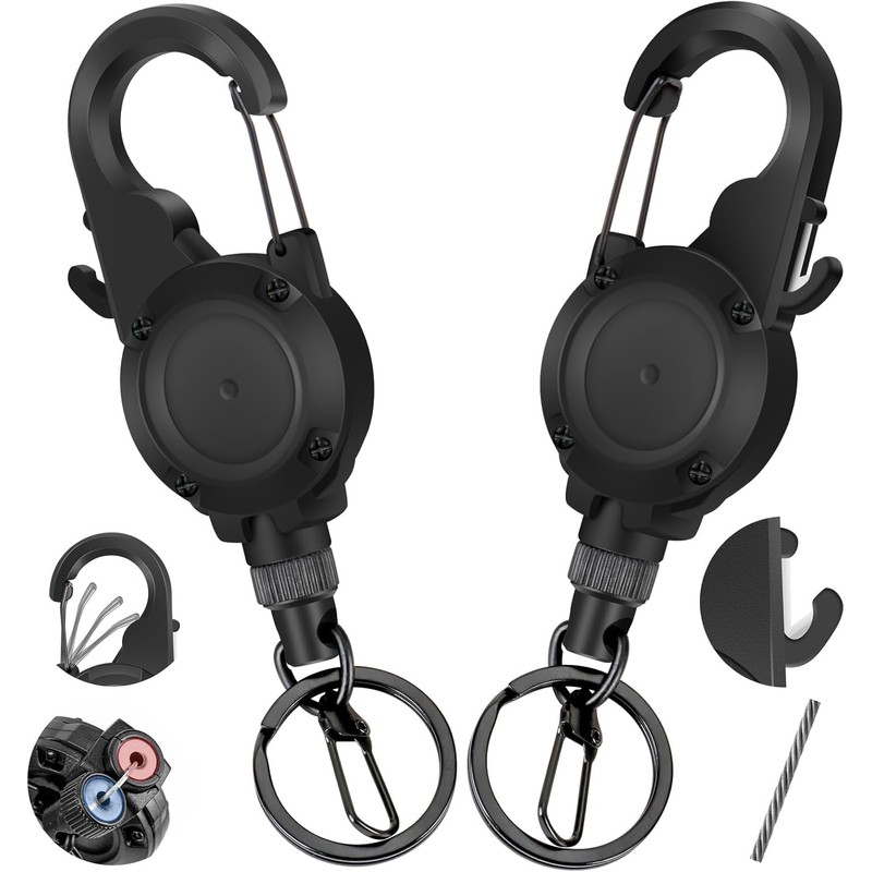 FINNECT Carabiner Pin On Reel with Blade Snap Carabiner Reel Key Reel Key Reel Telescopic Length 65cm for Camping Outdoor Fishing Key Chain Stretchable Durable Anti-lost Black Set of 2