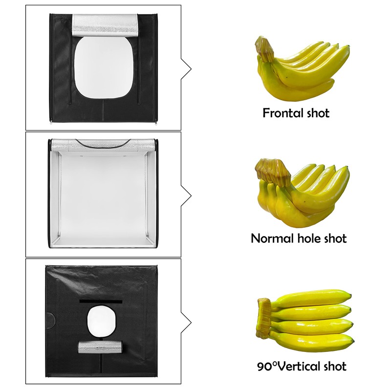 - 3 Way Openings(Front and top) for different shooting angles. Note: If you put the light softener on, you may not take pics from top opening, cutting a hole on the softener will enable imaging from above.
