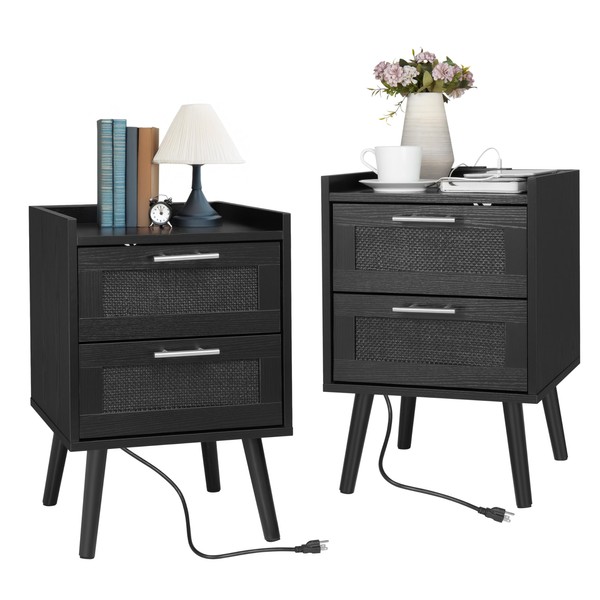 Finnhomy Nightstand with Charging Station, Bedside Table with 2 Hand Made Rattan Decorated Drawers, Night Stand with Storage for Bedroom, Full Black, Set of 2