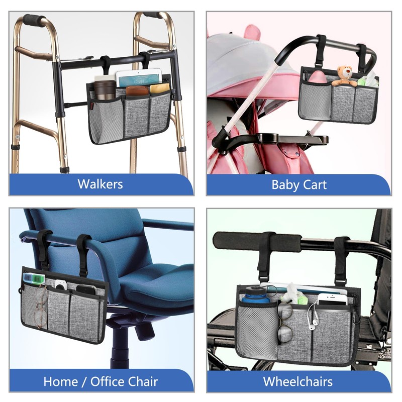 Attached with two adjustable hook-and-loop straps, you can attach and remove the straps to fits all standard wheelchairs, walkers, mobility scooters, office chairs, baby cart, and transport chairs.