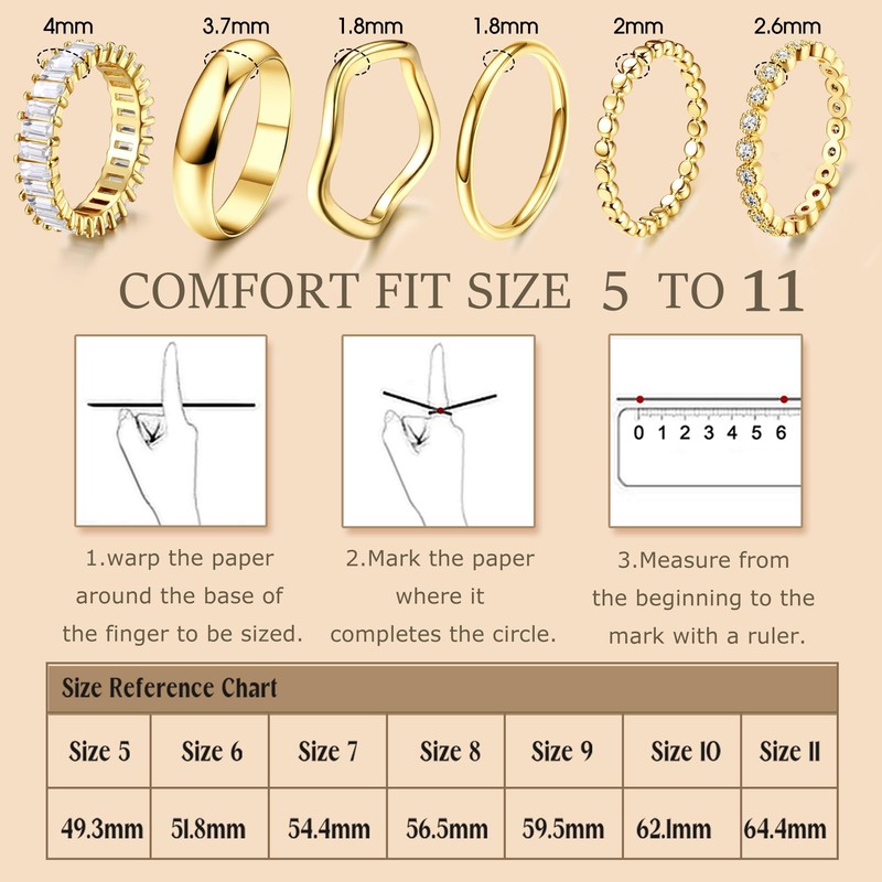 • Hypoallergenic Material: The gold ring sets for women non tarnish are made of high-quality copper material with 14K gold plated surface, these rings for women are free from nickel and chromium, making them safe and hypoallergenic for most skin types. Waterproof and highly polished design ensures they stay shiny and smooth. Accessorize your timeless beauty with jewelry that doesn't fade easily.