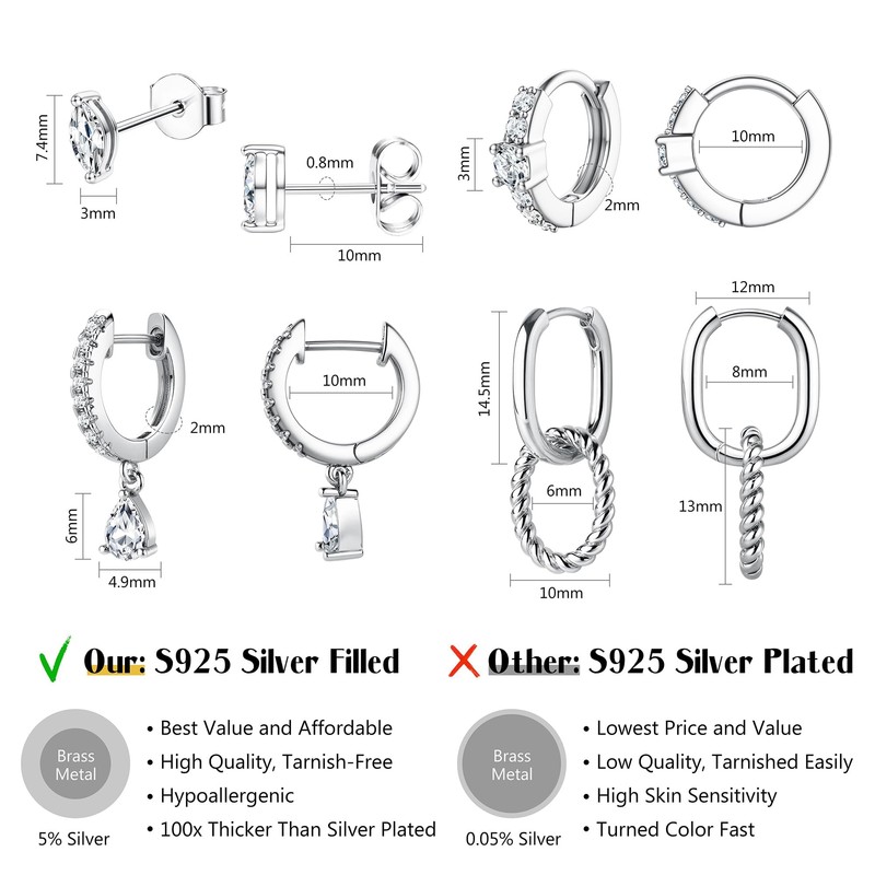 - Non Tarnish Silver Filled Earrings: Trendy silver earrings for women coated 5% sterling silver on the earrings sets surface, make these small stud hoop earrings shiny and textured, non-rust and not easy to fade, keep the earrings shiny for a long time, strong wear resistance and oxidation resistance, with a long service life, usually up to 5-10 years. Tarnish-resistant and durable silver earrings set, perfect for long-term wear