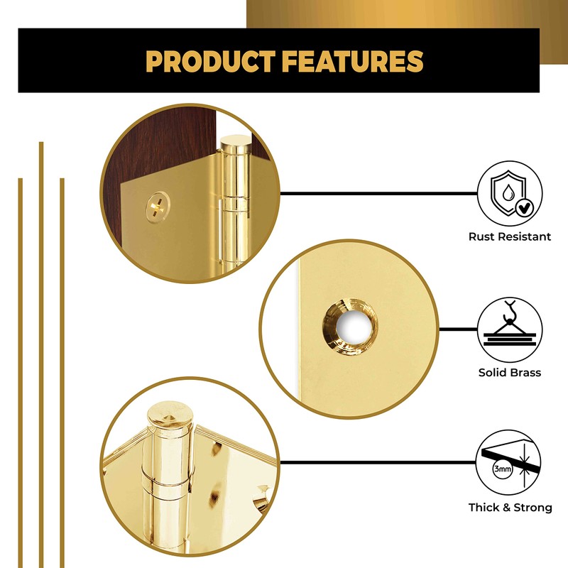 - QUALITY WORKMANSHIP - The hinges feature a bevel on the inside leaf, to ensure seamless and smooth closing of your door. The solid brass is highly resistant to outdoor rust, and the pin is made of rust-free stainless steel to ensure a smooth movement. Package includes: hinges, mounting screws, and tips.