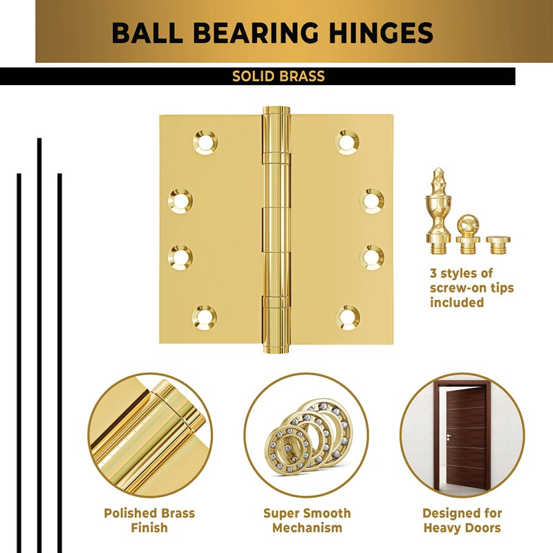 - BALL BEARING DOOR HINGES - These high quality ball-bearing hinges are made of extruded solid brass, which is known for its resilience, durability, and beauty. Ball bearing hinges are designed to handle heavy doors, and we are certain that this door hardware will beautify your doors and your home for many years to come.