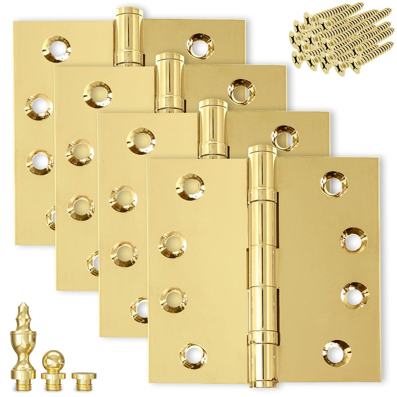 Finsbury Hardware Solid Brass Door Hinge Heavy Duty Ball Bearing Polished Shiny Gold 4.5 x 4.5 Inch with Decorative Screw-on Tips Included - Set of 4 Hinges (Polished Brass)