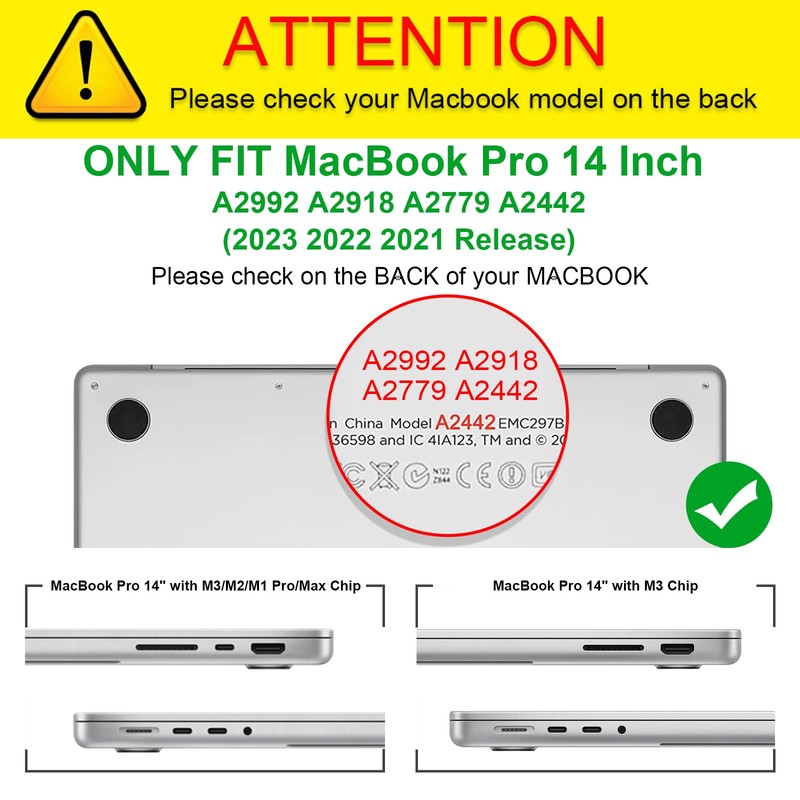 • Specifically designed for MacBook Pro 14 Inch 2023 2022 2021 Release A2992 A2918 A2779 A2442 M3 Pro / M3 Max / M3 / M2 Pro / M2 Max / M1 Pro / M1 Max Chip with Liquid Retina XDR Display & Touch ID. Not Compatible with other model laptops.