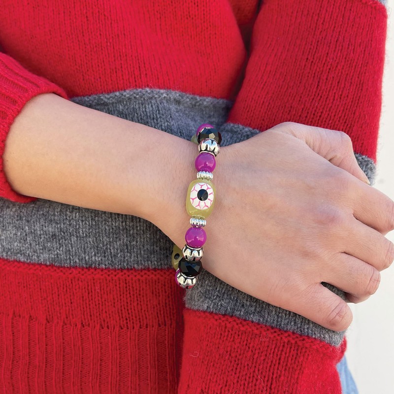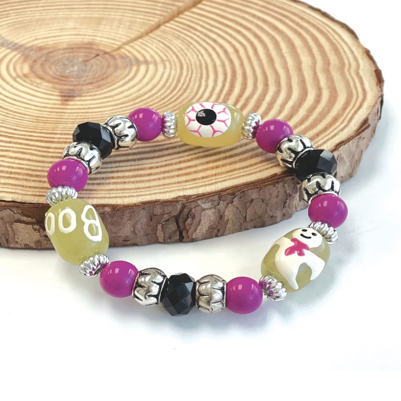 - UNIQUE & STYLISH: fiona's Halloween Eyeball Ghost BOO Glass Beaded Bracelet is designed to add more style to your look to make sure you look nothing short of fabulous when wearing it. The Eyeball Ghost BOO beads are Hand Painted to make it looks absolutely stunning! It’s stretchable making it perfect for everyone to use regardless of size. With an inner diameter of 2.5 inches and length of 7.25 inches, it fits most women.