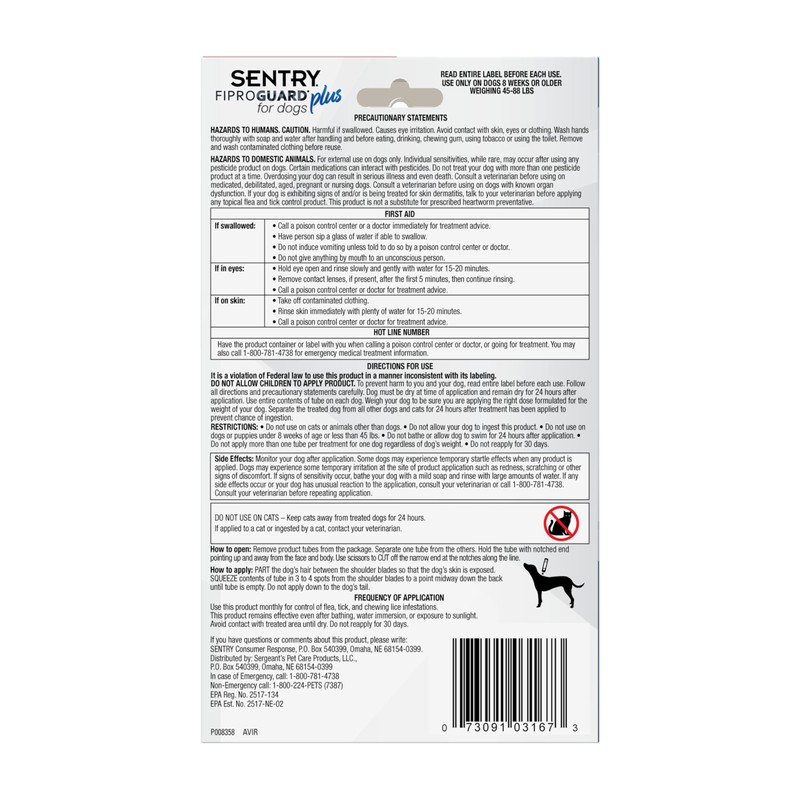SENTRY Fiproguard Plus kills fleas, flea eggs, flea larvae, ticks and chewing lice. Fast acting and long lasting, SENTRY Fiproguard Plus is a squeeze-on formulated to protect your dog against dangerous pests. It breaks the flea life cycle by killing flea eggs and larvae and kills ticks that may transmit Lyme disease.