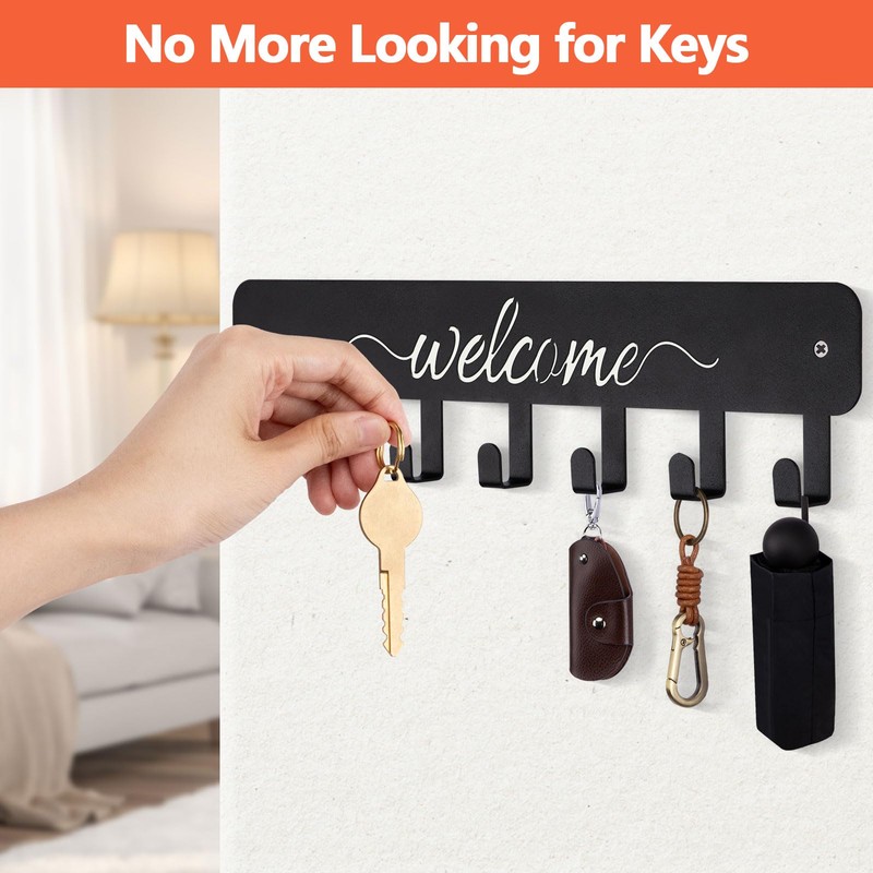 FIPUTE Key Holder for Wall,Metal Key Hanger with 7 Hooks,Key Holder Wall Mount,Metal Key Organizer Rack Hanger,Black Key Hangers,Wall Key Hook for Home Living Room Decor (Welcome)