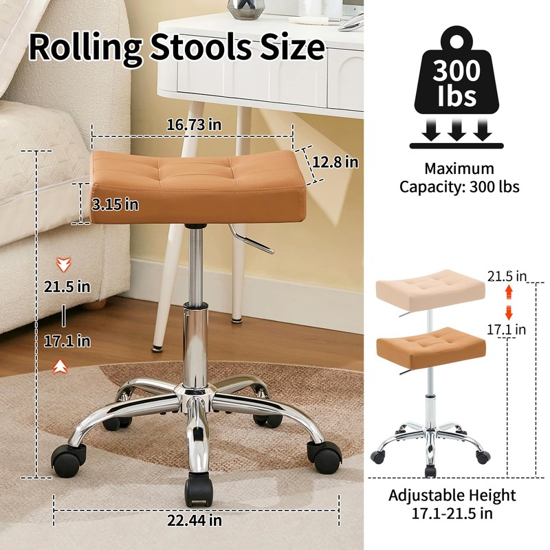 FIRAVOE Rolling Stool Adjustable Height (300lbs Capacity) (Sturdy Base) Multifunctional Nail Tattoo Vanity Massage Stool (Camel Brown)