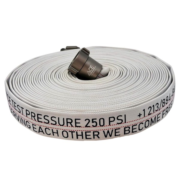 Introducing our new improved,CCC certified ultra lightweight attack fire hose. Do today what others won’t so tomorrow others can. Outstanding Quality! Outstanding Value! Hose Size - 1.5 inches (Inside Diameter) Hose Length - 75 feet Male Coupling - solid brass 1.5 inch NH / NST Swivel Female Coupling - anodized brass plated aluminum 1.5 inch NH / NST The Female Coupling Will Only Connect To A Male 1.5 NH / NST Compatible Nozzle - 1.5 inch NH / NST only Hose Type - Polyester Single Jacket. Color - White Liner - TPU Liner (Thermoplastic Polyurethane) Approximate Width Laying Flat - 2.5 inches Service Pressure - 250 PSI Proof Burst Pressure - 500 PSI Pre-rolled Stay Safe and God Bless. ACEFIREPreparedness.com ACE FIRE Hoses are Single Jacket Reel Fire Attack Hose Lightweight for home upgrade fire defense plan. ACE CCC Certified and Teasted single jacket construction woven from 100% polyester that is lightweight and easy to deploy. Anodized aluminum couplings, TPU Lining. The lining of each reel fire hose is a single-ply extruded tube of synthetic polyurethane /thermoplastic (T.P.U.), designed to be light weight for ease of operator use and increase packing ability for fire preparedness and firefighting applications. The TPU liner of these fire hoses produces a thin, smooth waterway that yields extremely low friction loss for maximum flow rates. The reel hose manufacturing process ensures positive adherence to the jacket to prevent de-lamination.