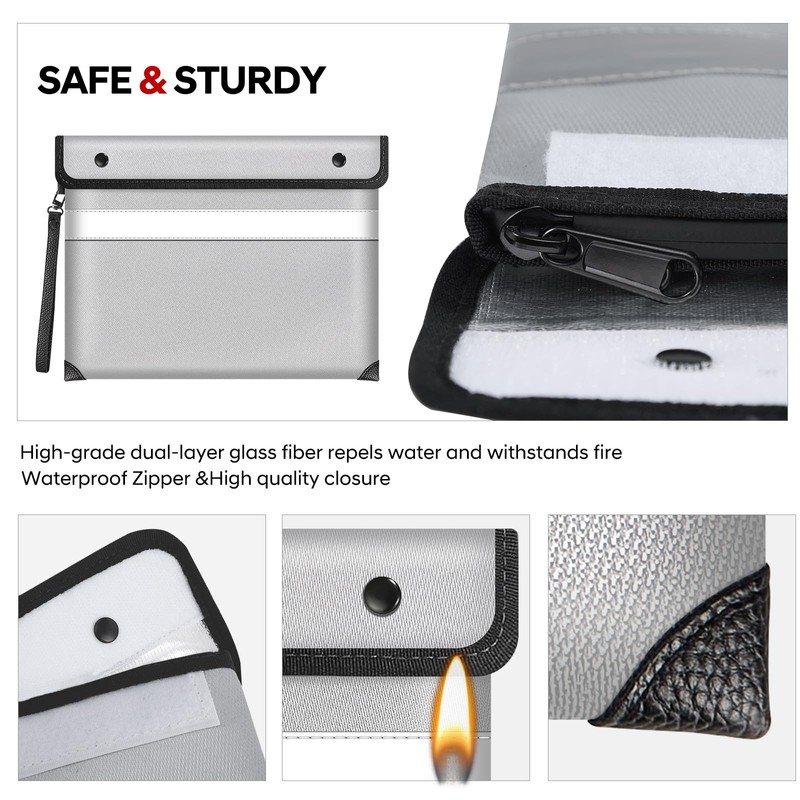 - 👜【Convenient to Carry】Measuring 13.9x10.6 inches, this fireproof document bag fits A4-sized A4 document holder, tablets, diplomas, degrees, and state licenses. Its fire-resistant silicone also prevents users from being allergic to fiberglass, making you more comfortable and safe. It has a super soft hand strap that makes it easy to pick up and carry. It's also lightweight at just 0.8 lbs, so it won't weigh you down.