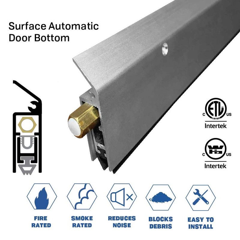 Legacy’s patent-pending automatic door bottom is primarily installed at the bottom of a door. The product is offered in a variety of anodized and powder coated options. The unit is mainly used to protect against air, fire, smoke, and noise. Many of Legacy’s units are fire rated and sound rated. The seal within the automatic door bottom is concealed when the door is open. When the door closes, the brass hex nut plunger is mechanically activated by hitting against either the frame or the pre-installed seal. The gasket then drops down in a scissor-like motion creating a continuous seal along the floor. The self-leveling feature allows for a tight seal even when the floor is not parallel to the door. This product does not come with end caps.