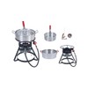 - ALL-IN-ONE: Fryer package includes everything you need to cook up a variety of delicious meals. Included is a robust propane fueled burner base, a high quality 10 quart fry pot, aluminum strainer basket with heat resistant handle and a 5 inch tall stainless thermometer.