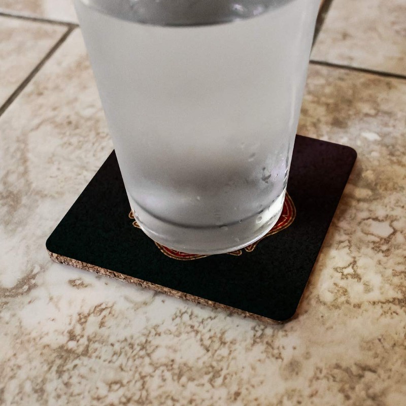 • Each coaster features the graphic shown printed with special UV and water resistant inks. Sold as a set of four.