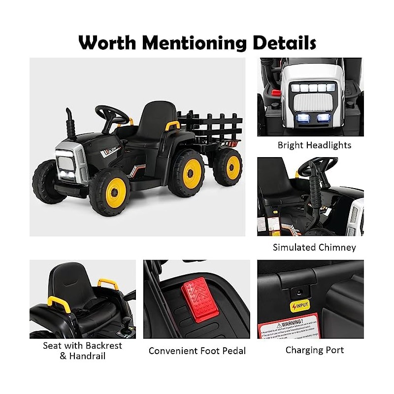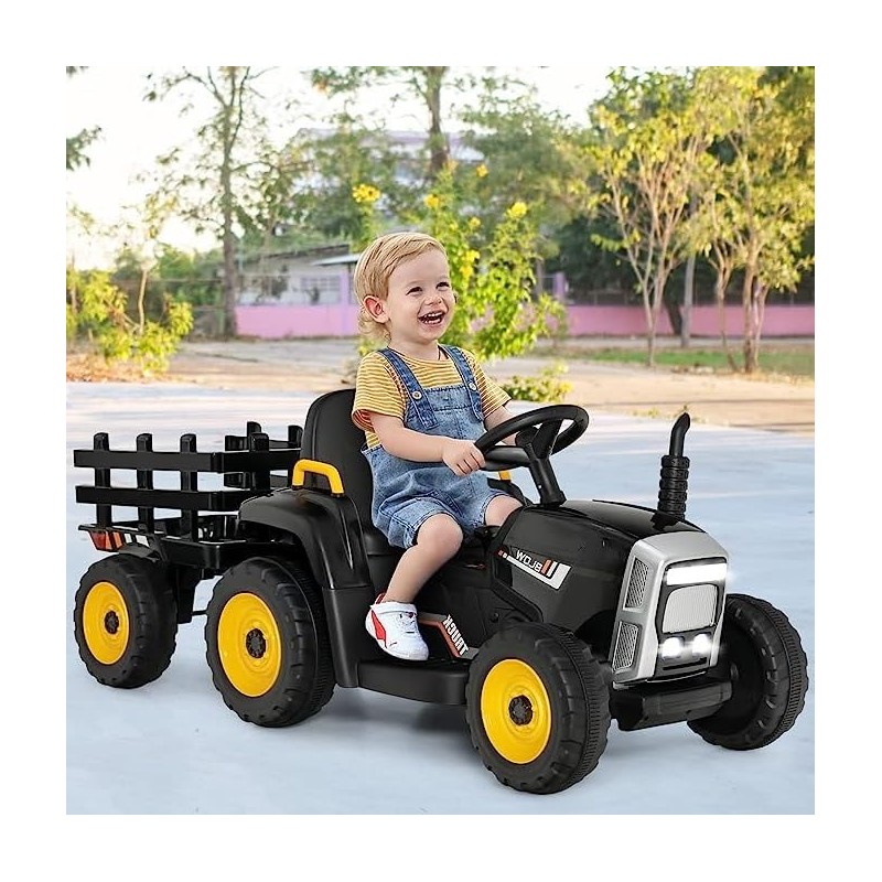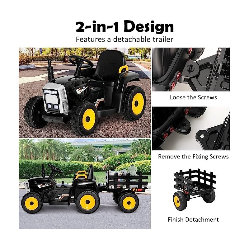 Fireflowery Kids Ride on Tractor, 12 V Battery Power Wheels w/Remote Control & Detachable Trailer, Electric Tractor Toy w/USB & Bluetooth Audio Music, 3-Gear-Shift, Safety Belt, Black