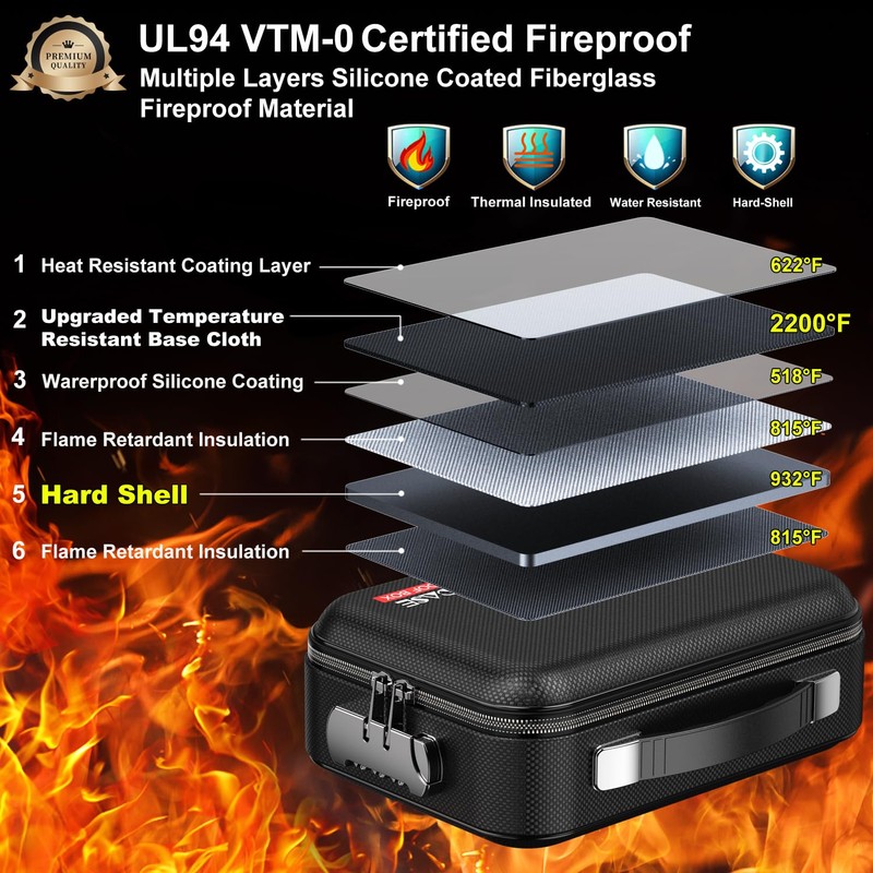 - UL- VTM- Certified Fireproof Box C COLCASE fireproof cash box is made of high- quality fire retardant non-itchy silicone coated fiberglass which can stands up against fire and passed the UL- VTM- Burning Test.