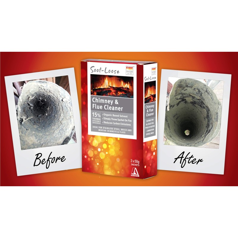Firewise Soot-Loose makes cleaning your chimney/flue quick and easy, Soot-Loose is based on a non-flammable, non-hazardous, non-corrosive organic solvent which travels up the chimney or flue and dissolves the tar and creosote that has accumulated over time. With regular use Soot-Loose will prevent the build-up of tar, creosote and soot in your chimney/flue, while increasing efficiency of your heater, reducing its smoke emissions and preventing dangerous flue fires. Unlike salt based flue cleaners, Soot-Loose will not corrode stainless steel flues.