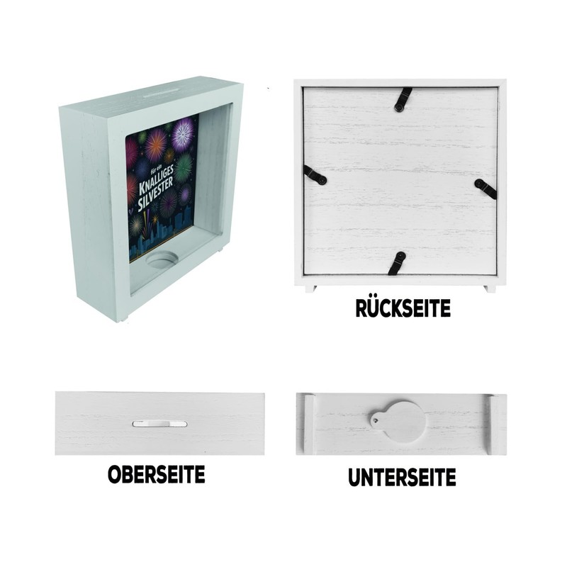 - High quality wooden frame money box. Dimensions: approx. 16.5 x 16.5 x 5 cm. Easy money removal at the bottom. The money box is made of high-quality, white lacquered wood and a plastic viewing window. The motif on the inside is printed on an aluminium plate. The money slot measures 4.5 cm. The back wall of the money box can be opened like a picture frame and the motif in it (approx. 15.1 x 15.1 cm) and replaced with your own motif.