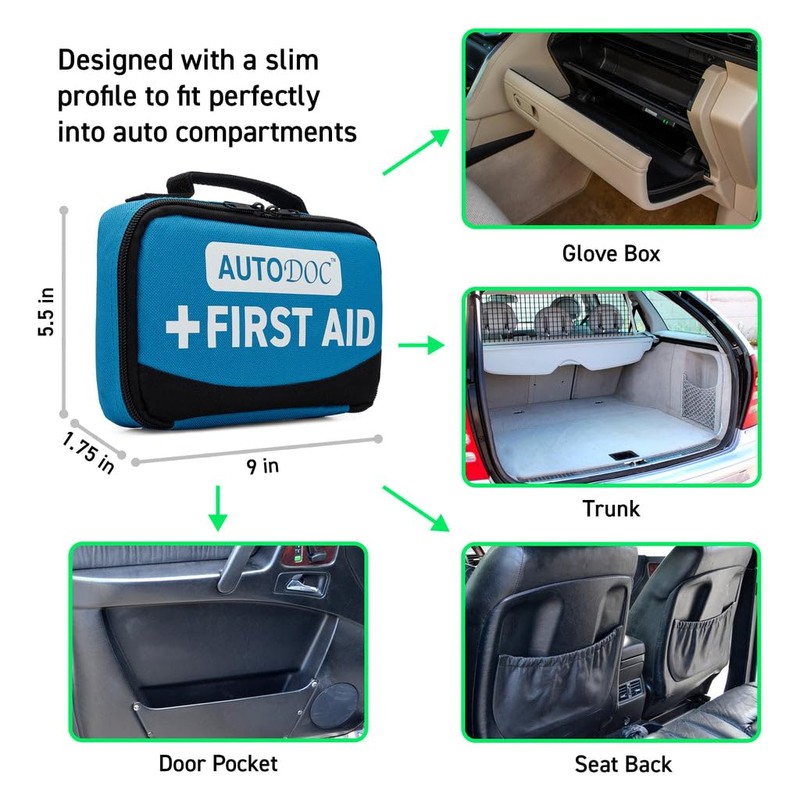 - Compact and Convenient Design: Our emergency car kit is tailored for vehicles and features a slim, flexible blue vinyl case. At 5.5 x 9 inches and less than 2 inches thick, it easily fits in glove boxes, door pockets, and trunk compartments, keeping essential first-aid items within reach. Our first aid kit for trucks and cars is easy to store without sacrificing valuable space in your travel vehicle.