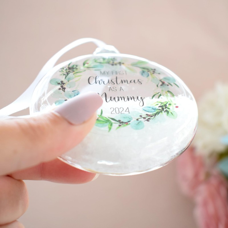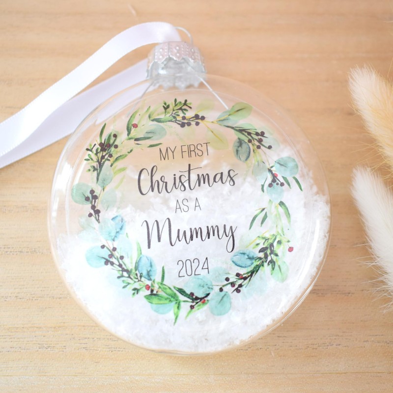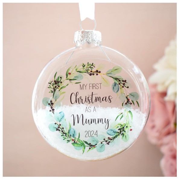 This bauble features the image of a festive eucalyptus and berry wreath on it as pictured in the photographs and has the text "My First Christmas As A Mummy 2024". It is part filled with lovely fluffy faux snow. I have created a whole range that matches in other versions such as Baby's 1st Christmas, Mr & Mrs, New Home and many more.