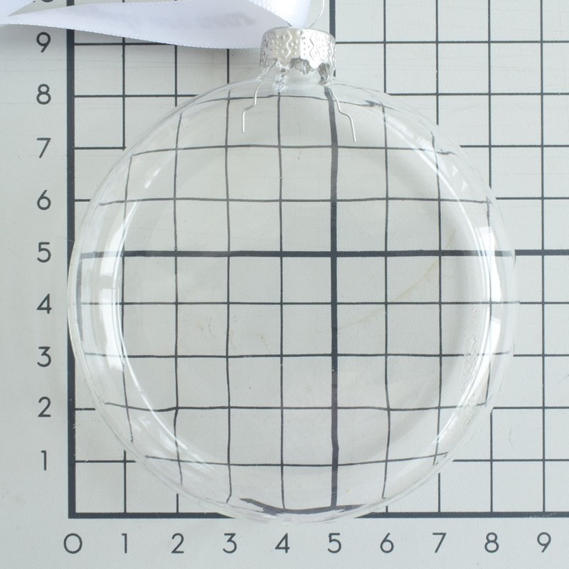Each bauble is 8.5cm wide/high x 2cm deep (not a globe shape, it is flatter), Round shaped glass bauble which is threaded with an approx 8cm long white satin ribbon.