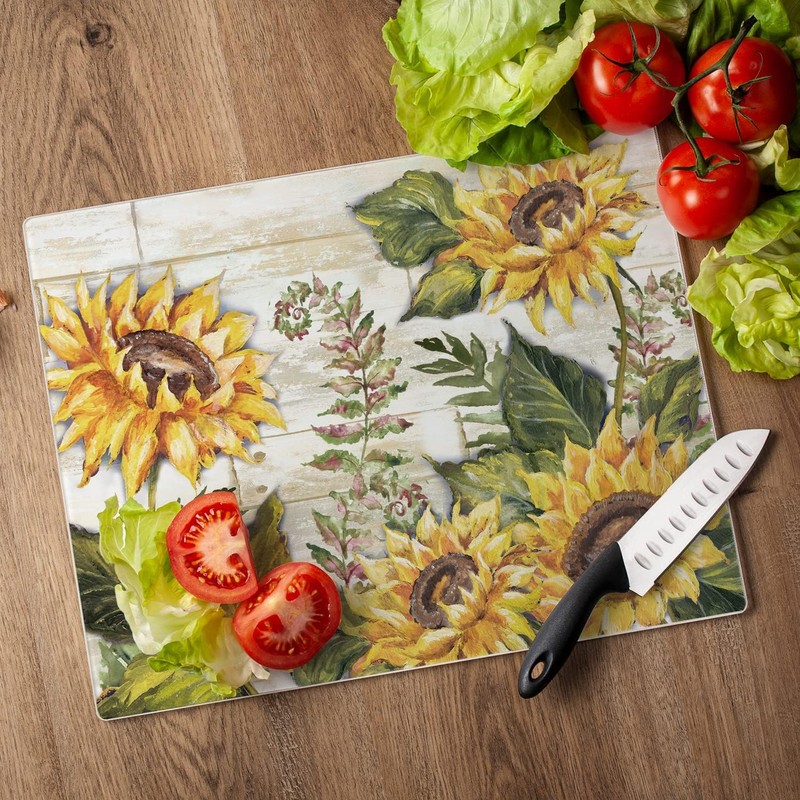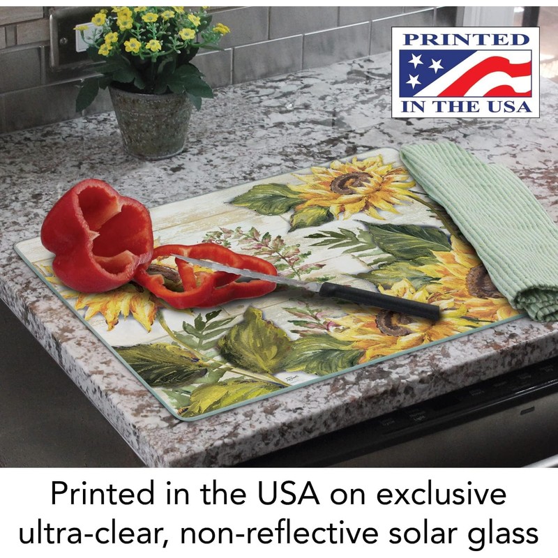 FIRST DAWN Glass Cutting Board Counter Saver 12""x15"", Sunflowers, Large
