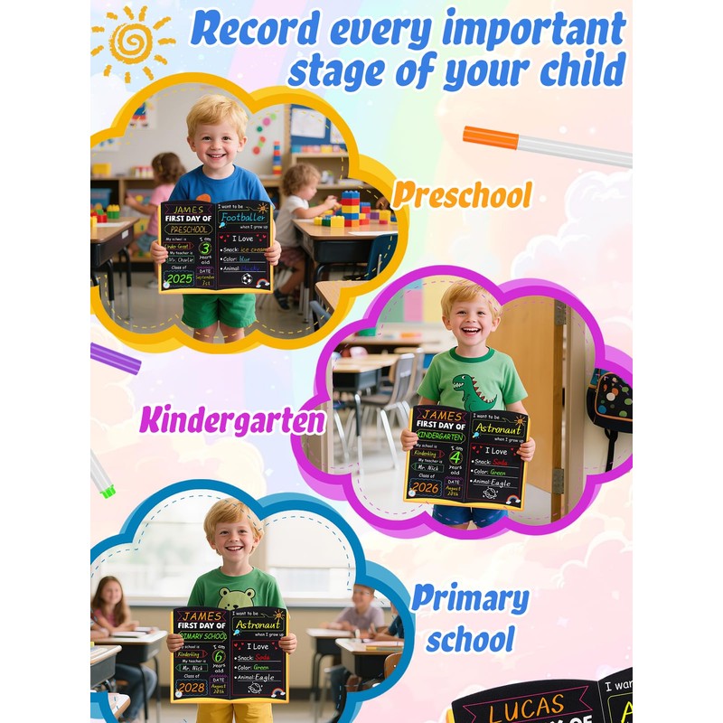- Creating Wonderful Memories: Kids can fill in their name, age, teacher, school, favorite subject, favorite color, dreams and more on the first day of school board. It is a perfect photo prop to capture memorable moments of the first/last day of school.