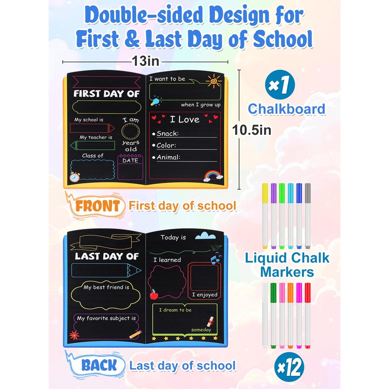 - Easy to Wipe: This surface of the 10.5 x 13 inches double-sided chalkboard sign is covered with film that kids can write on smoothly with the included 12 color markers. And the last day of school sign is easy to wipe clean with a damp cloth or wet tissue, making it reusable.