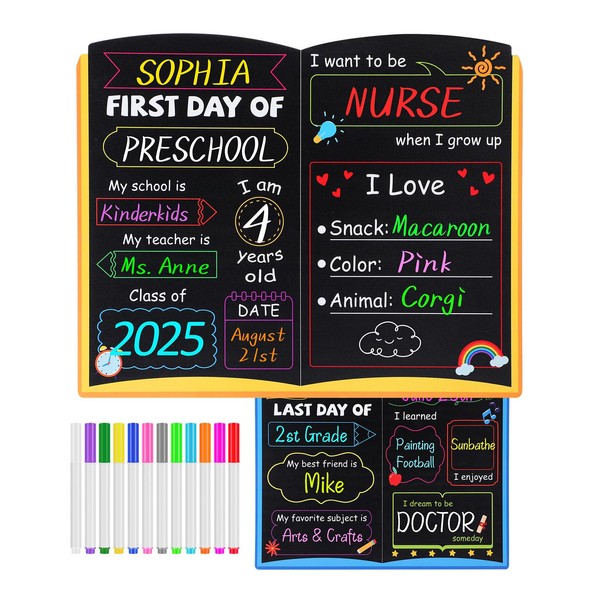 First Day of School Sign with Erasable 12 Chalk Markers - 10.5'' x 13'' Double-Sided First & Last Day Chalkboard Signs, Easy to Clean, for Kids Preschool Kindergarten, Back to School Essential
