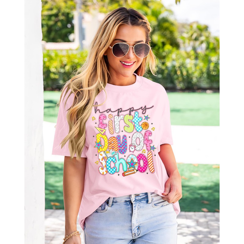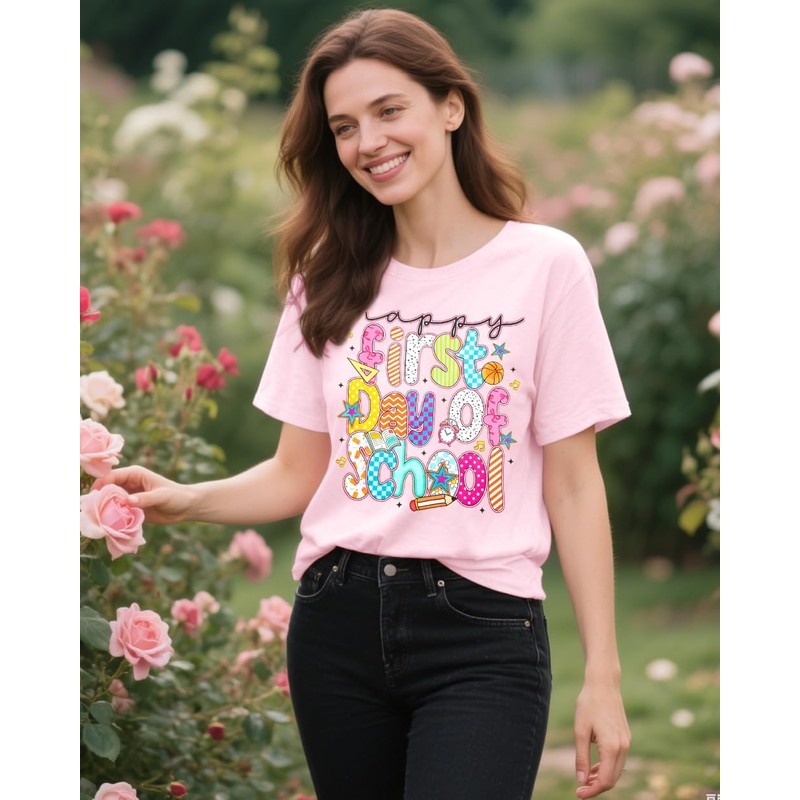 - Happy First Day Graphic Tee: Happy first day of school t-shirt teacher shirt.The playful graphic and bright lettering celebrate your love for teaching and make it perfect for the first day of kindergarten, elementary, or preschool.