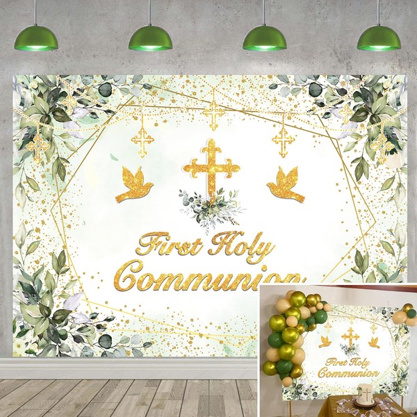First Holy Communion Backdrop Greenery Baptism God Bless Backdrop Gold Cross Green Leaves Neutral Baby Shower Decorations Background (8X6FT (240x180cm))