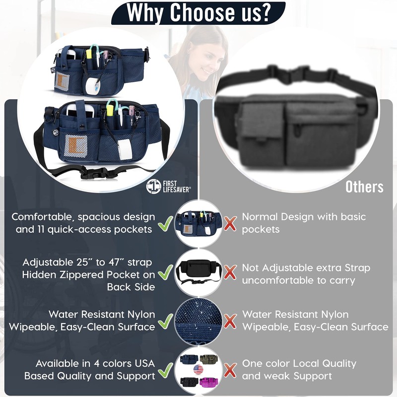 - Long, Adjustable Waist Strap – Able to fit around the waist our nurse’s fanny pack as an adjustable 25” to 47” strap to make it easier and more comfortable to carry without sacrificing movement or mobility