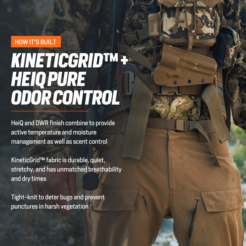 - Specs | [Primary Usages] Hunting, Tree Stand, Turkey, Spot & Stalk; [Cut] Athletic; [Material] KineticGrid; [Pockets] 2 Hand, 2 Cargo, 2 Zippered Rear; [Belt] Integrated Low-Profile; [Weight] 13oz