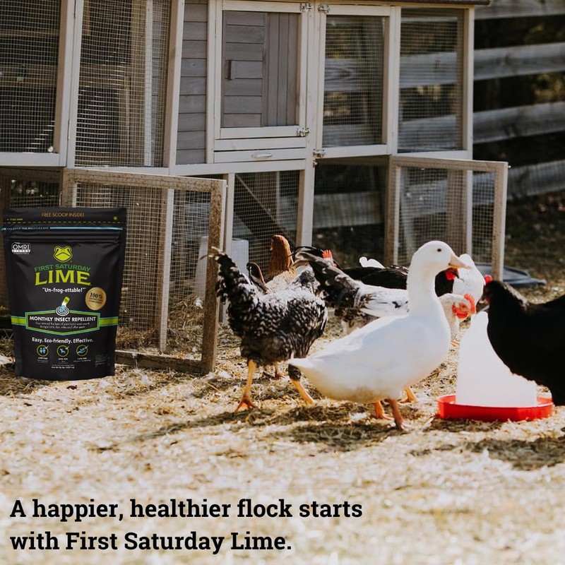 - Freshen & Deodorize Barns & Coops-Utilize First Saturday Lime to repel insects from chickens, eliminate chicken odors, and reduce moisture in the chicken coop by sprinkling 1/8 inch across bedding. It can be applied on top of or under mats.
