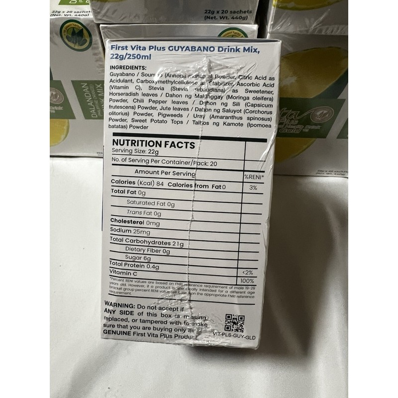 First Vita Plus Natural Health Drink Guyabano Gold 22 grams x20 sachets ) expiration Nov 21, 2026. Each box contains 5 healthy ingredients that are beneficial for our healthy lifestyle and prevention of all health issues that one’s suffer.