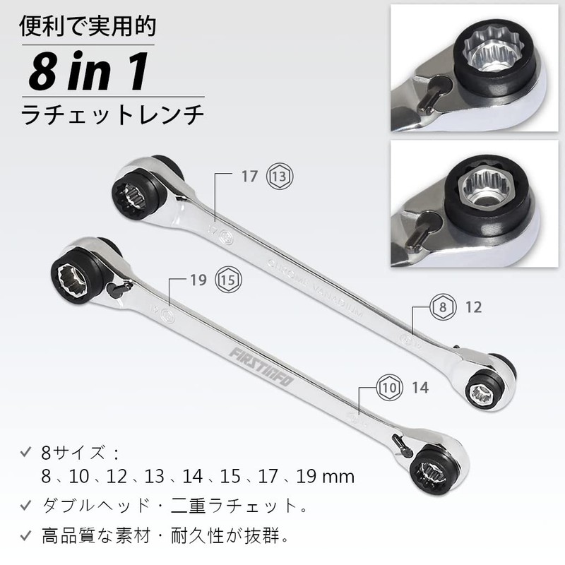 Firstinfo Tools 8-in-1 Ratchet Wrench 8/10/12/13/14/15/17/19mm 12 Square CR-V Steel Material Compatible with 8 Sizes