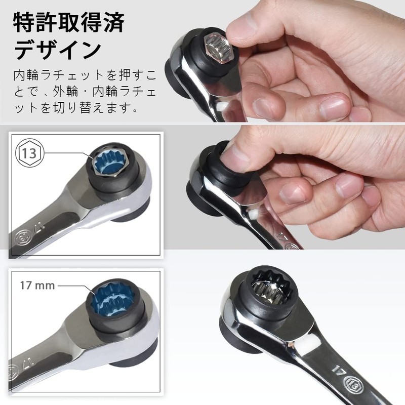 1.8-in-1 Ratchet Wrench: This is a 12-sided surface ratchet wrench that can be used with 8, 10, 12, 13, 14, 15, 17, 19mm sizes.
