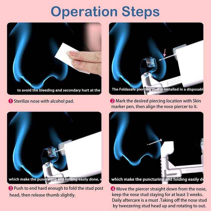 • 【Remarkable Advantages】- Unique design on foldable nose stud with same diameter of nose stud tip and post, after nose piercing, no bleeding, no secondary injury due to bent nose stud, easy operation ,fits for single person,home use,manicure owner, beauty shop holder,tattoo shop owner.
